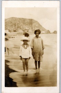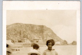 Niña con vestido visiblemente sucio, aparece en la fotografía junto a un niño con sombrero y cuello de marinero; ambos aparecen a orillas del mar de un balneario no identificado. De fondo, se observa un morro, y en las faldas de éste, algunas construcciones.