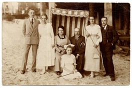 Familia compuesta por dos parejas de jovenes, más una niña que sostiene una vara al igual que una de las jovenes retratadas, aparecen en la fotografía junto a una pareja de adultos que se ubica al interior de una sombrilla de la época, en balneario de Las Salinas.