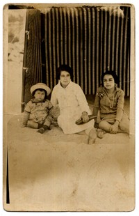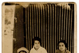 [Mujer junto a dos niñas en tienda de un balneario] [fotografía]. [Chile : entre 1920 y 1930]. 1 fotografía : monocromo, gelatina sobre papel fibra ; 14 x 9 cm .