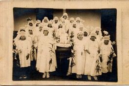 Grupo de niñas vestidas de blanco, con velos y guantes, aparecen retratadas alrededor de estatuilla de la Vírgen María, ubicada sobre una mesa de mimbre al centro de la fotografía. Cada niña sostiene un ramo de azucenas en las manos, del que están amarradas cintas que llevan impreso sus nombres.