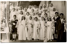 Grupo de niñas vestidas de blanco y con velos, aparecen en la fotografía retratadas junto a algunos niños en una escalera cerca de un jardín. Ellas y ellos sostienen ramos de azucenas, de los que están amarradas cintas impresas con sus nombres. El niño del costado derecho y algunas niñas sostienen libros pequeños.