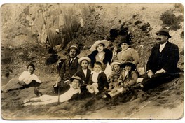 Grupo familiar compuesto por mujeres y hombres adultos con sombreros y bastones, aparecen en la fotografía junto a niños y niñas a los pies de un cerro o colina en balneario de Constitución.
