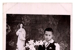Niño con medalla y una cinta de "Recuerdo de mi Primera Comunión" sujetada a su chaqueta, aparece en la fotografía junto a estatuilla de la Vírgen María y sosteniendo en las manos un ramo de azucenas y un libro pequeño. La pared y el suelo están recubiertos por una tela floreada.