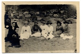 Grupo de mujeres con sombreros y boinas, aparecen en la fotografía junto a dos hombres, en balneario no identificado.