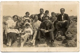 Una familia compuesta por mujeres y hombres adultos, niños pequeños y un niño de meses, aparece en la fotografía sentada en roquerío de un balneario no identificado.