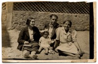 Mujer adulta aparece en la fotografía junto a hombre joven con pañuelo en el cuello y a joven adolescente. En el centro de la fotografía, se observa a una niña pequeña con cinta en el cabello. Tras ellos, y en el balneario en el que se encuentran, se observa una construcción de piedra con reja de madera.