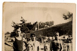 [Mujer y hombre junto a jovenes y niño en un balneario] [fotografía]. [Chile : entre 1920 y 1930]. 1 fotografía : monocromo, gelatina sobre papel fibra ; 14 x 9 cm .