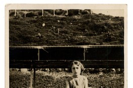 Niña aparece en la fotografía sentada en una roca grande de un balneario no identificado. Atrás, se observa a otras personas reunidas, junto a un muro de piedra y bajo una colina con vegetación.