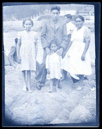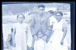 Familia aparece en la fotografía, sobre roquerío de un balneario no identificado. En el centro de la fotografía se observa a un hombre con un niño delante suyo, a los lados una mujer adulta y de una niña. De fondo, las construcciones de esa localidad.