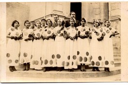 Nueve mujeres aparecen en la fotografía con el mismo diseño de vestido, adornos de cabello y guantes, en la escalera de entrada a un edificio institucional. Detrás de ellas, se observa a dos hombres y a dos niños.