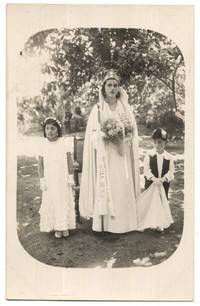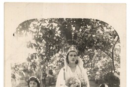 En el centro de la fotografía, y en un lugar abierto y con árboles, aparece una mujer con corona y sosteniendo un ramo de flores, junto a dos niños, uno de los cuales sostiene la cola de su vestido. La niña que la acompaña viste de blanco al igual que la mujer, y tiene adornos en el cabello. Porta una cinta donde se lee "ASM. Aida, Nogales noviembre 16 de 1935"