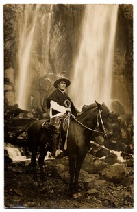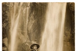 [Hombre montado en caballo delante de una cascada] [fotografía]. [Chile : entre 1920 y 1940]. 1 fotografía : monocromo, gelatina sobre papel fibra ; 14 x 9 cm .