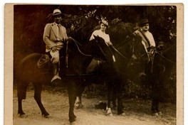 Mujer con sombrero montada a caballo, aparece en la fotografía junto a dos hombres con quienes cabalga en un lugar de frondosa vegetación.