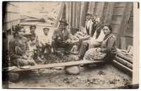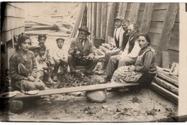Hombre adulto con sombrero, aparece al centro de la fotografía rodeado por niños y adultos, mientras sostiene un crustáceo y lo exhibe a la cámara. El grupo aparece sentado entre dos construcciones de madera que forman un pequeño pasaje en el que están en círculo. Más atrás, se observa dos canastas de mimbre, y al fondo, madera apilada.
