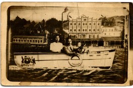 Mujer y hombre joven aparecen en la fotografía detrás de una lancha donde se lee "La chilenita-Valdivia", pintada en un telón de fondo, donde además se observa la representación de una ciudad, presumiblemente Valdivia [Río Calle-Calle].