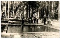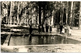 Mujeres y un niño, aparecen en la fotografía dentro de una piscina ubicada en medio de árboles de eucaliptus. Alrededor de la piscina, y de pie, se observa a una familia compuesta por adultos y niños.