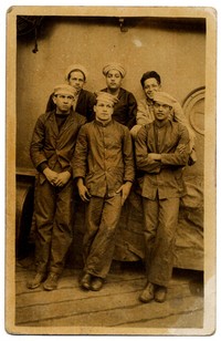[Trabajadores portuarios afuera de un barco] [fotografía]. [Chile : entre 1920 y 1930]. 1 fotografía : monocromo, gelatina sobre papel fibra ; 14 x 9 cm .