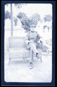 [Retrato de uniformado sentado en sillón de mimbre en un parque] [fotografía].