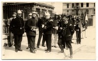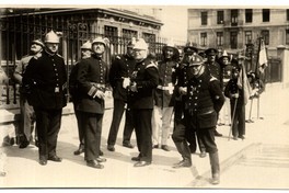 Grupo de bomberos aparecen en la fotografía observando una situación externa, y que se produce en la altura, y que tiene relación con el ejercicio general que practican. Además de los bomberos, tres niños portan estandartes. Atrás, se observa edificios detrás de las rejas que protegen un edificio.
