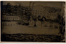 Dos mujeres y un hombre aparecen detrás de la embarcación "La Valdivia" pintada en telón de fondo, como parte de un paisaje donde aparece de fondo un edificio, otras embarcaciones y árboles diversos. Al costado derecho de la fotografía, y fuera del telón, se alcanza a divisar a otra persona.