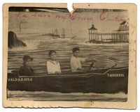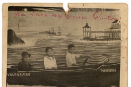 Dos niños, uno de ellos con traje de marino, aparecen en la fotografía junto a mujer adulta con sombrero, detrás de la embarcación "Valparaíso Torpederas", pintada en telón de fondo utilizado por el fotógrafo minutero, y que forma parte de un paisaje costero.
