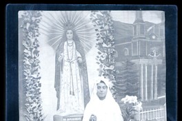 [Niña en su Primera Comunión junto a imagen de Purísima de Lo Vásquez] [fotografía]. [Chile] : 1955. 1 fotografía : negativo sobre papel ; 9 x 7 cm. .
