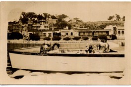 Niña aparece en la fotografía detrás de una embarcación pintada como telón de fondo, y en la que se lee "Recuerdo (Cartagena)". Atrás, se observa parte de dicho balneario, el mirador y las construcciones de esa localidad.