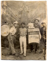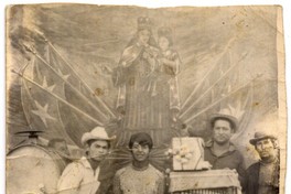 Chinchinero, organillero, un joven y un adulto con sombrero, aparecen retratados delante de imagen de la Vírgen del Carmen, pintada en telón de fondo y utilizado por fotógrafo minutero.
