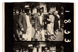 Dos hombres caminando por calle Ahumada [fotografía]. [Santiago : entre 1920 y 1930]. 1 fotografía : monocromo, gelatina sobre papel fibra ; 9 x 9 cm. .