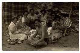 En la fotografía se observa a un grupo pequeño de personas reunidas en torno a la comida y bebida dispuesta sobre un chal en la arena, y delante de roquerío de un balneario no identificado.