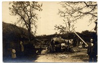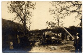 Casa campestre donde vemos a una mujer apoyada en la puerta de una choza en un patio donde otra mujer está frente a un gran horno de barro; también se puede ver a dos niñas y un hombre.