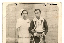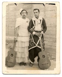 Mujer y hombres con guitarra, aparecen retratados con indumentaria típica. De fondo, un muro de concreto.