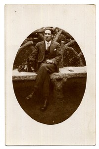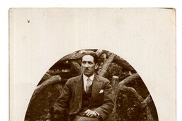 [Dramaturgo Antonio Avecedo Hernández, sentado junto a un perro] [fotografía]. [Chile : entre 1930 y 1940]. 1 fotografía : monocromo, gelatina sobre papel fibra ; 14 x 9 cm .