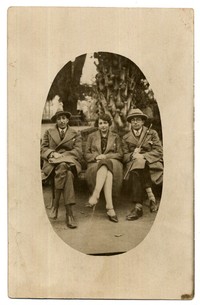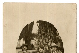 Una mujer con abrigo aparece en la fotografía sentada en una banca del Parque Cousiño junto a dos hombres con sombrero.