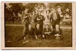 Grupo de mujeres y hombres aparecen en la fotografía reunidas en Parque Cousiño. Atrás de los retratados, se observa una carreta con caballos, un vehículo de la época y árboles.