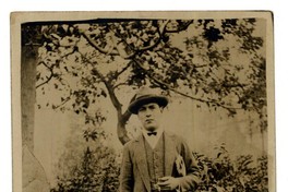 Hombre con sombrero, humita, un periódico bajo el brazo y que fuma, sostiene la mano de niña pequeña de abrigo y sombrero, en una plaza o jardín público. De fondo y frente a ellos, se observan arbustos y árboles, y al extremo izquierdo de la fotografía, parte de una silla de madera.