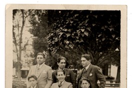 Grupo de seis jovenes aparecen en la fotografía sentados en una banca de una plaza no identificada.