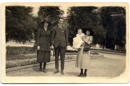 Mujer de vestido y sombrero negro, aparece en la fotografía junto a un hombre y a una mujer de vestido claro, y que sostiene a un niño de meses en los brazos, en un jardín. De fondo, se lee "Chalet Suisse [Resta]urant".