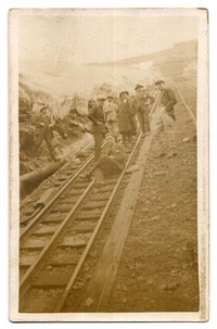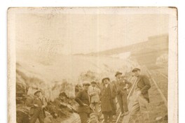 Grupo de hombres con boinas, abrigos y sombreros, y uno de ellos con una pipa, aparecen en la fotografía en los durmientes ubicado al costado de un pequeño cerro nevado, en la Planta hidroeléctrica Los Queltehues. De fondo se aprecia parte de la infraesctrucutra del lugar.