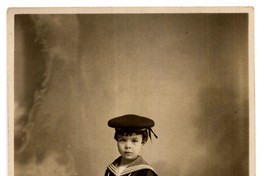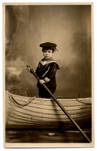 Niño con indumentaria de marino y boina, aparece en la fotografía sosteniendo un remo dentro de un bote en el que es retratado en un estudio.