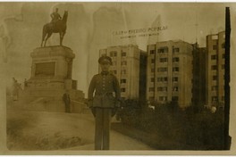 Uniformado es retratado cerca del monumento al General Baquedano en la Plaza que lleva su nombre, también conocida como Plaza Italia. De fondo, los edificios residenciales Turri, en los que se lee en el cartel publicitario ubicado en la azotea "Caja de Credito Popular. Ahorros préstamos".