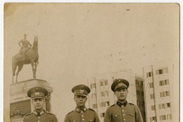 Grupo de tres uniformados aparecen retratados cerca del Monumento al General Baquedano ubicado en la Plaza que lleva su nombre. De fondo, se observa las torres residenciales Turri.