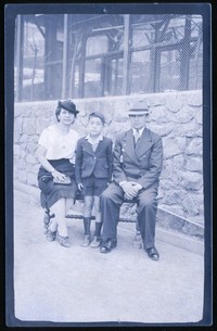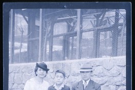 Mujer con sombrero aparece en la fotografía sentada en una banca, junto a hombre con sombrero y a niño que está en medio de los dos y de pie. De fondo, muro de piedra y enrejado, presumiblemente de una jaula de aves.