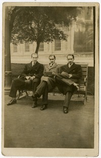 [Hombres con sombreros en una banca en plaza Vicuña Mackenna] [fotografía]. [Chile : [entre 1920 y 1930]. 1 fotografía : monocromo, gelatina sobre papel fibra ; 14 x 9 cm. .