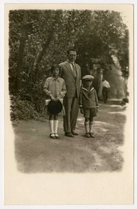 [Hombre y niños en cerro Santa Lucía] [fotografía]. [Chile : entre 1920 y 1930]. 1 fotografía : monocromo, gelatina sobre papel fibra ; 13 x 8 cm. .