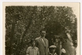Hombre junto a una niña que sostiene un periódico y una boina, y a un niño con cuello de marino y boina, aparecen retratados en el cerro Santa Lucía; se observa a un hombre de espalda caminando bajo los árboles.