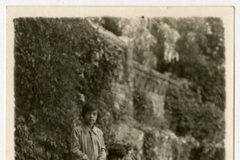 Niña aparece en la fotografía detrás de un niño con cuello de marino que está sentado en una roca, presumiblemente del Cerro Santa Lucía.
