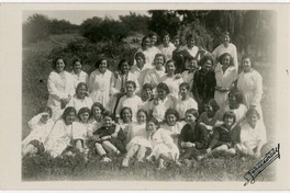 Grupo de mujeres estudiantes aparecen retratadas; la mayoría con delantales blancos, en un campo en Maipú, como se indica en la cara opuesta, en un paseo de curso.
