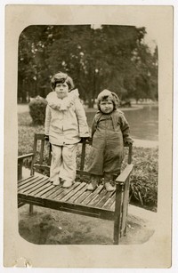 [Dos niños disfrazados de espalda a una laguna] [fotografía]. [Santiago] : Casa Hans Frey, [entre 1920 y 1940] . 1 fotografía : monocromo, gelatina sobre papel fibra ; 14 x 9 cm. .