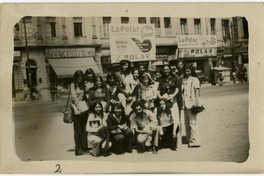 Grupo de estudiantes adultos, mayoritariamente mujeres, aparecen retratadas en La Alameda en Santiago, a la altura del 2000, sector Estación Central. Al medio del grupo, una mujer sobre un poni utilizado por el fotógrafo minutero. De fondo, se observan los carteles publicitarios de "Librería y Juguetería "El Aguila", "La Polar", La Ermita, entre otras.